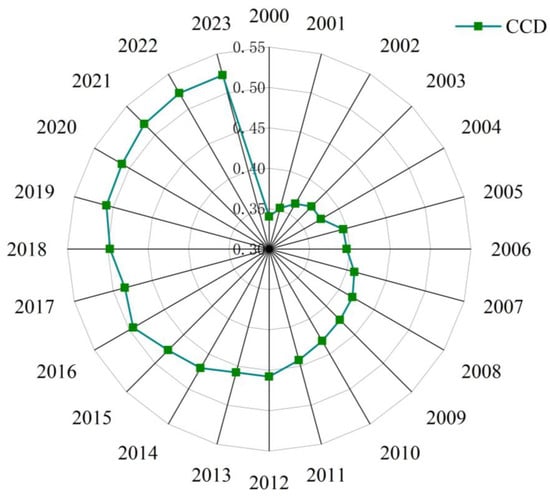 A coupling coordination index model was used to calculate the coupling coordination levels among systems in the Qilian Mountains and adjacent cities. The annual average coupling coordination index for each of the 12 cities reflects each city’s agricultural coupling coordination level. Figure 5 shows the coupling coordination results for the Qilian Mountain Life Community from 2000 to 2023. From a temporal perspective, the degree of coupling coordination between the mountain, water, forest, farmland, lake, grassland, and sand subsystems, and the social, governance, and actor systems in the Qilian Mountains and adjacent areas showed a general increasing trend. It rose from 0.340 in 2000 to 0.523 in 2023, corresponding to a 53.7% increase and suggesting a transition from the low-coordination stage to the high-coordination stage. This trend suggests a potential shift from mutual constraints toward mutual promotion between the social and ecological subsystems over the study period.