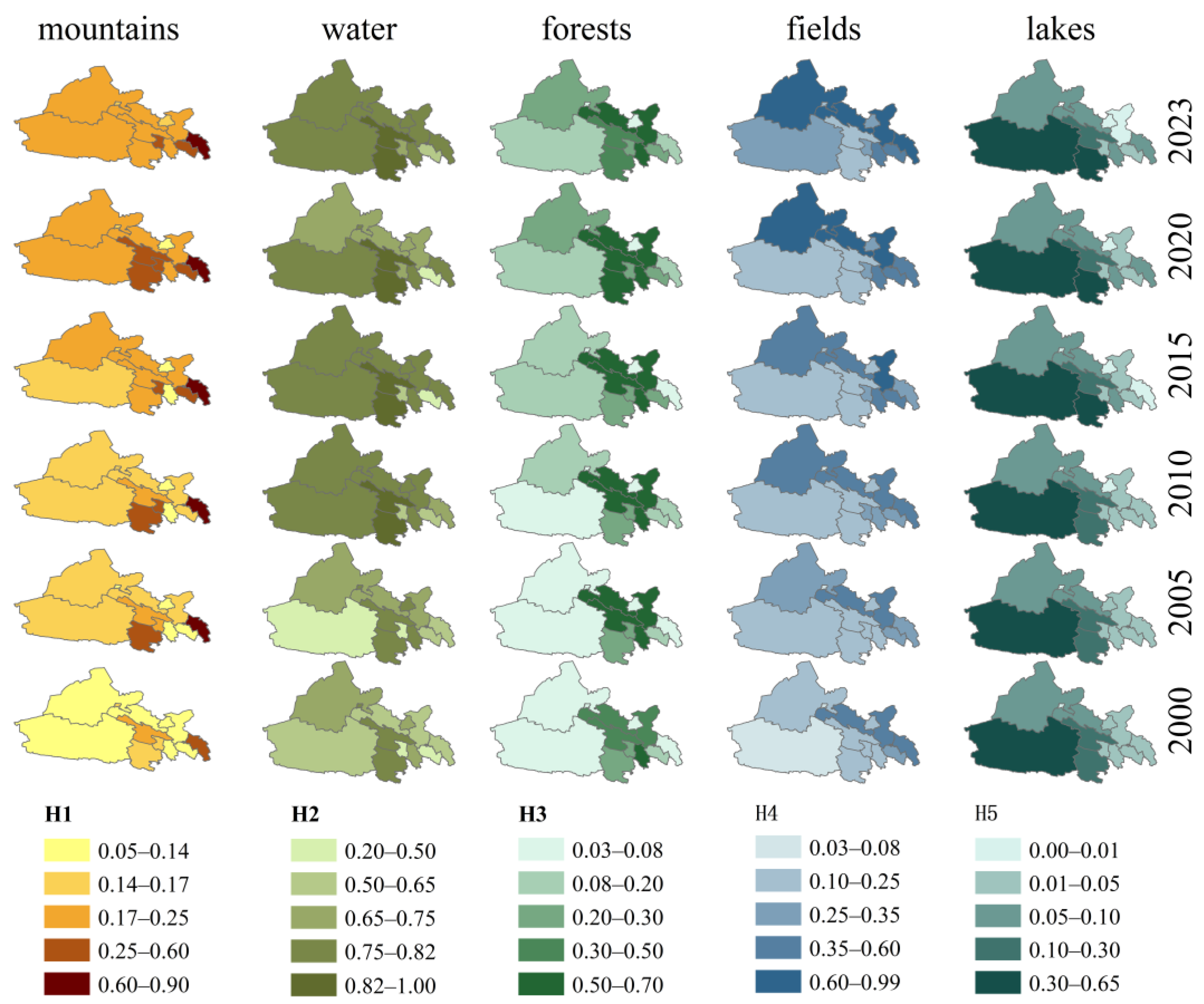 - Nie, J.L.; Guan, D.J.; Xie, T.T.; Zhou, L.L.; He, X.J. Identification of health diagnosis types and restoration pathway optimization for the mountains-rivers-forests-fields-lakes-grasslandssands life community in China. Res. Soil Water Conserv. 2025, 32, 418–429. [Google Scholar]