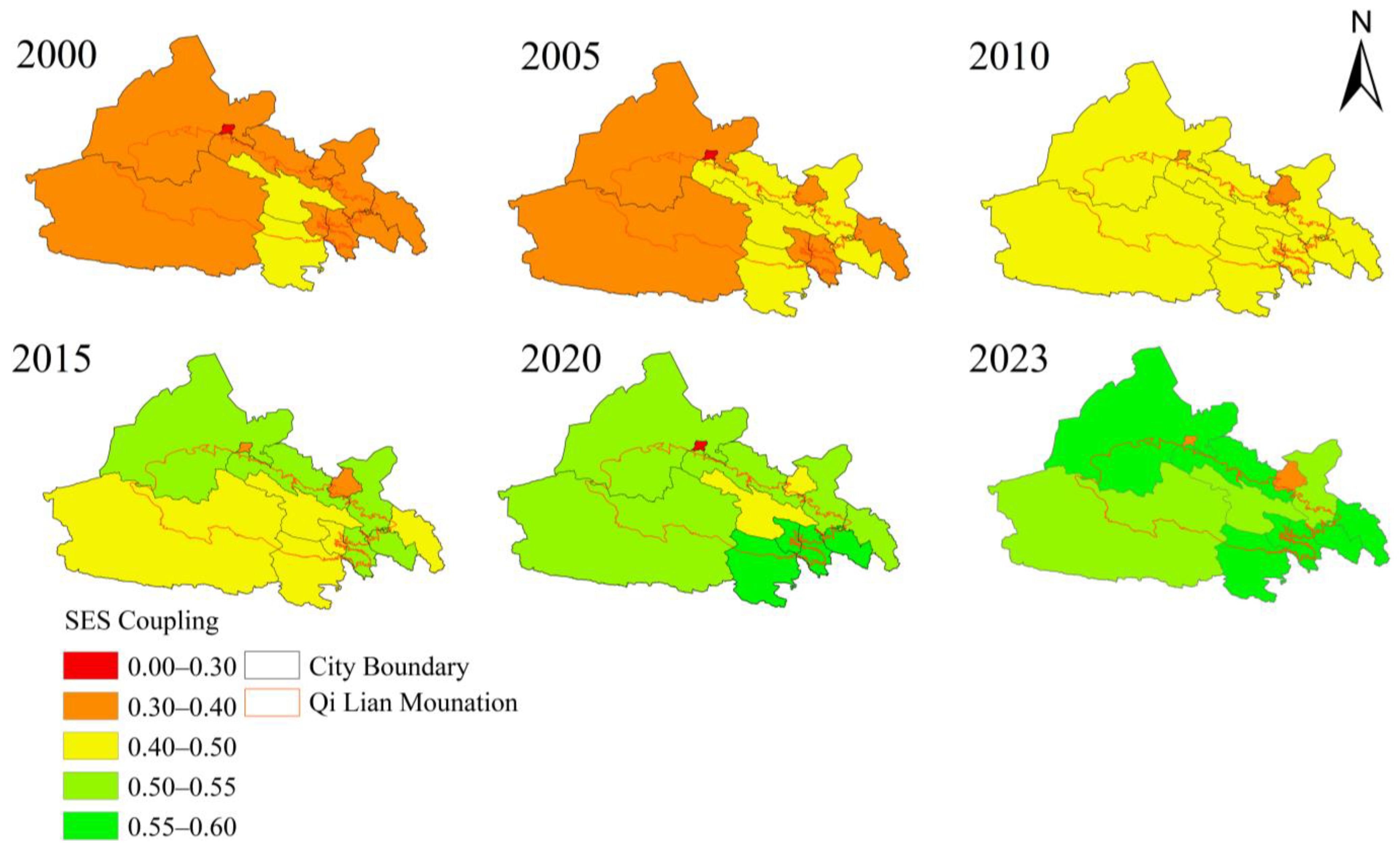 3.2. Analysis of Coupling Coordination Between Society and Ecosystem