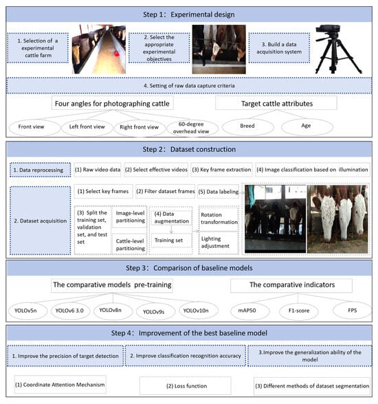 This section describes the overall methodology employed to develop and evaluate the proposed multi-cattle facial recognition framework. The research consists of four stages: experimental design, dataset construction, comparative selection of baseline models, and improvement of individual recognition models for multiple cattle. The overall framework is illustrated in Figure 1.