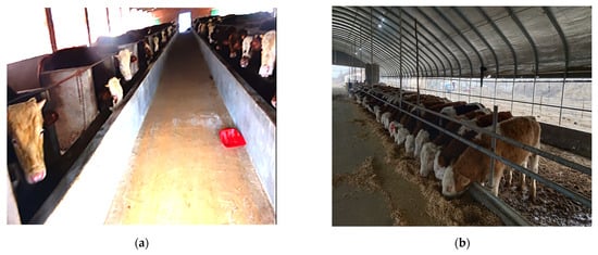 The field experiment was conducted on two commercial beef cattle farms: Farm A, located in Jiangxi Province, China, from 18 to 24 November 2018; and Farm B, located in Xuchang, Henan Province, China, from 15 to 25 June 2022, both of which raise Simmental and yellow beef cattle (Ycattle) under semi-intensive feeding systems. The cattle farm environment is shown in Figure 2.