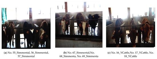 In this experiment, extract frames containing clear facial regions using code programs based on the video data obtained from the experiment. After extracting frames from the video data, a preliminary dataset of over 600,000 raw cattle face images was obtained. To ensure dataset diversity and representativeness, image selection covered: multiple head poses (frontal, overlook, side), different lighting conditions (natural daylight, shadowed), varying degrees of occlusion (none, partial, severe). These raw images exhibit characteristics of a complex environment, presenting significant challenges as illustrated in Figure 3a–c. As each recording session lasted only 10–15 min, the posture of most cattle remained largely unchanged, resulting in multiple images of the same animal captured from similar viewpoints. Following frame extraction, the majority of low-quality or highly similar images were removed to ensure the overall quality of the dataset. Images exhibiting notable variations in illumination or head pose were retained to maximise dataset diversity, which also helped reduce computational load and improve processing efficiency. The final dataset consists of data from 135 cattle, with 2368 facial images (including 50 negative images) collected from 123 cattle used for training the model. The remaining data from 12 cattle were reserved for external validation to evaluate the model’s generalisation ability. The cattle were selected in a balanced manner across two farms, and each cattle was assigned a unique ID, ranging from “NO 1_Breed” to “NO 135_Breed”, and a professional image annotation tool LabelImg was employed to draw bounding boxes for each image. The cattle breeds include Simmental cattle and Ycattle. This dual-farm design provided a broader range of environmental variations. Farm A introduced high-density indoor scenes with frequent occlusion and illumination shifts, while Farm B emphasised natural light and moderate density, ensuring comprehensive evaluation of model generalisation.
