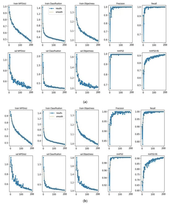 Model training was conducted on an NVIDIA RTX 3080 GPU (24 GB VRAM) using the PyTorch-2.2.1 framework. The initial learning rate was set to 0.001 with a cosine decay schedule. The AdamW optimizer was employed, with a batch size of 16 and a total of 200 epochs. The input resolution was 416 × 416 pixels, and early stopping combined with model weight averaging was adopted to stabilize convergence and prevent overfitting. The best-performing model checkpoint was selected based on the highest mAP50 achieved on the validation set.