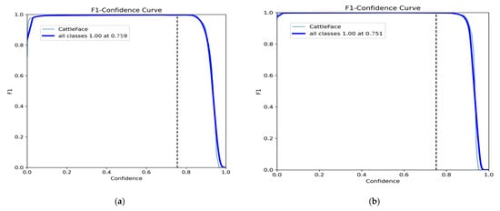 Model performance of cattle face detection under different dataset partitioning methods. (a) The performance of the F1-confidence curve when the image-level partitioning dataset. (b) The performance of the F1-confidence curve when the cattle-level partitioning dataset.