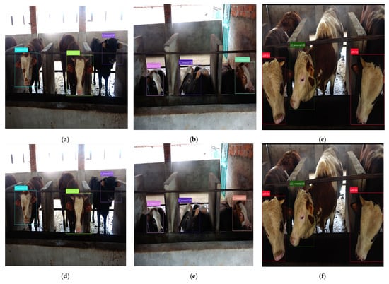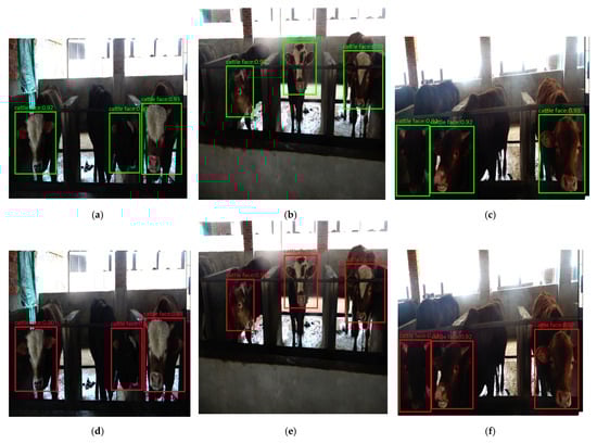 Illustrates the results of multi-object cattle face detection under different dataset partitioning strategies. Images (a–c) present the detection results of the model trained on the image-level partitioned dataset, whereas images (d–f) show the detection results obtained from the model trained on the cattle-level partitioned dataset.