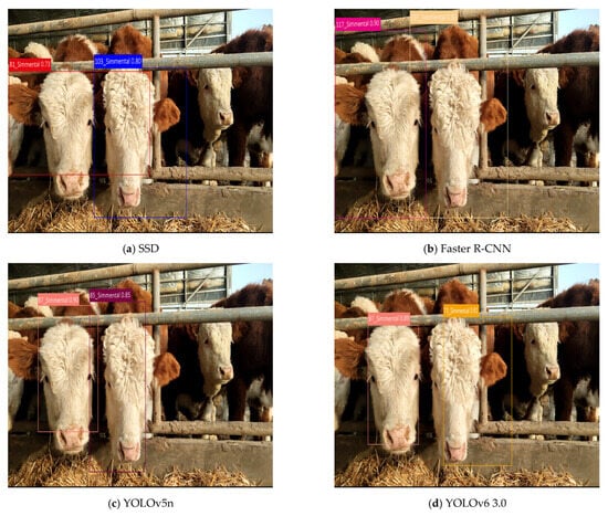 According to previous research findings, the YOLO series of algorithms demonstrates significantly higher training precision and speed in animal facial recognition tasks compared with traditional approaches [34,35,36,37,38]. Therefore, this study analyzes object detection and classification algorithms by comparing algorithms such as SSD, Faster R-CNN, YOLOv5n, YOLOv6 3.0, YOLOv8n, YOLOv9s, and YOLOv10n. The comparison aims to evaluate the advantages and disadvantages of these algorithms to select the most suitable one for cattle face recognition and optimization. The results indicate that YOLOv8n shows obvious advantages in both recognition precision and speed, particularly in handling noise in complex cattle farm environments.