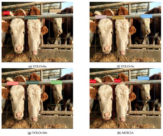 Although MOICIA did not correctly classify every unseen individual, its predictions for new cattle exhibited noticeably lower confidence (0.20–0.50), indicating appropriate uncertainty regarding unobserved identities. These errors stem from typical closed-set behavior, in which unseen individuals are forced into the closest known class. Under the adopted evaluation rule, predictions with confidence above 0.5 are treated as confident assignments to trained identities, whereas values below 0.5 are regarded as uncertain or unmatched. Among the baseline models, YOLOv8n, YOLOv9s, and YOLOv10n seldom missed detections but frequently misidentified new cattle with high confidence (0.55–0.90). In contrast, the proposed model benefited substantially from the Coordinate Attention Module, which strengthened the capture of discriminative bovine facial cues, and from the MPDIoU loss, which improved sensitivity to facial keypoint geometry and enhanced bounding-box centrality for unseen individuals. These improvements led to the expected gains in robustness and precision. For clarity, typical examples of the eight models under partial occlusion and inter-cattle similarity are compared in Figure 10.