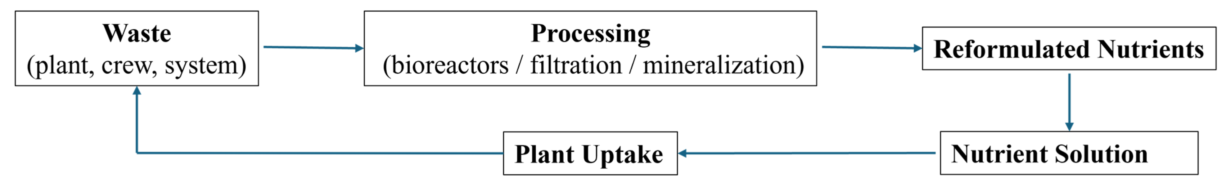 - Frossard, E.; Crain, G.; de Azcárate Bordóns, I.G.; Hirschvogel, C.; Oberson, A.; Paille, C.; Pellegri, G.; Udert, K.M. Recycling nutrients from organic waste for growing higher plants in the Micro Ecological Life Support System Alternative (MELiSSA) loop during long-term space missions. Life Sci. Space Res. 2024, 40, 176–185. [Google Scholar] [CrossRef]