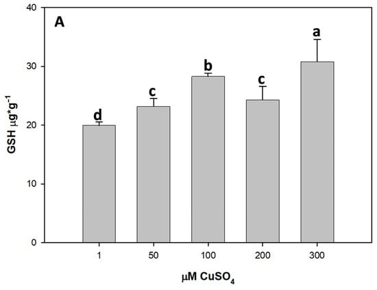 The exposure of explants to the heavy metal induces many stressors, including a significant increase in ROS within the culture environment, resulting in different abnormalities that disrupt the metabolic functions of the plant, even at the molecular level [61]. GSH levels of in vitro olive shoots are shown in Figure 5A; results from ANOVA showed they were statistically significant, with p = 0.032. The content of GSH was increased by treatment with Cu. At optimal or low concentrations of Cu, such as 50 µM, plantlets could sustain or marginally elevate GSH levels to improve antioxidant defense. The increase of Cu concentrations in the media stimulates the accumulation of GSH as a part of the antioxidant defense response. At the highest concentration of Cu (300 µM), GSH increased by 54.3% compared to the control shoots (Figure 5A). GSH is a low molecular weight tripeptide compound that contains a sulfhydryl group and is an important metal chelator and antioxidant [62], which facilitates the regulation of the cell cycle, cell detoxification, and subsequently antioxidant defenses. Through the AsA, GSH cycle (AsA–GSH), GSH improves the tolerance to Cu. Other studies have confirmed that with the increase in Cu concentration, the content of protein thiol in the cells of green algae Scenedesmus increased, while the content of GSH, in contrast, significantly decreased [63]. In addition, Thounaojam et al. [64] found that the content of GSH increased under Cu stress, and the tolerance of rice to Cu improved.