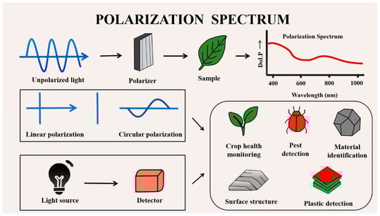 Polarization spectroscopy is an analytical technique that integrates polarization information with spectral measurements, enabling the characterization of how agricultural materials interact with polarized light [18]. In this review, we briefly introduce the basic principles of polarization spectroscopy and summarize its representative applications in agricultural engineering (Figure 1). A detailed comparison of its detection mechanisms and advantages over traditional spectroscopy is presented in Section 2.4.
