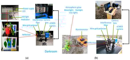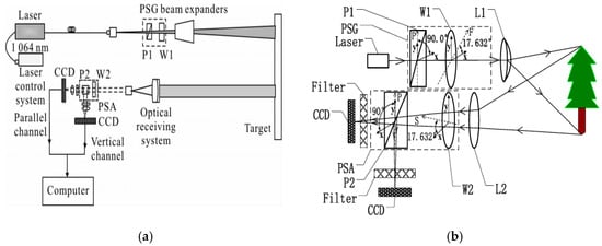 Measurement of moisture content using laser polarization system: (a) optical path of laser polarization imaging measurement system [94]; (b) optical path of the polarized active imaging system [95].