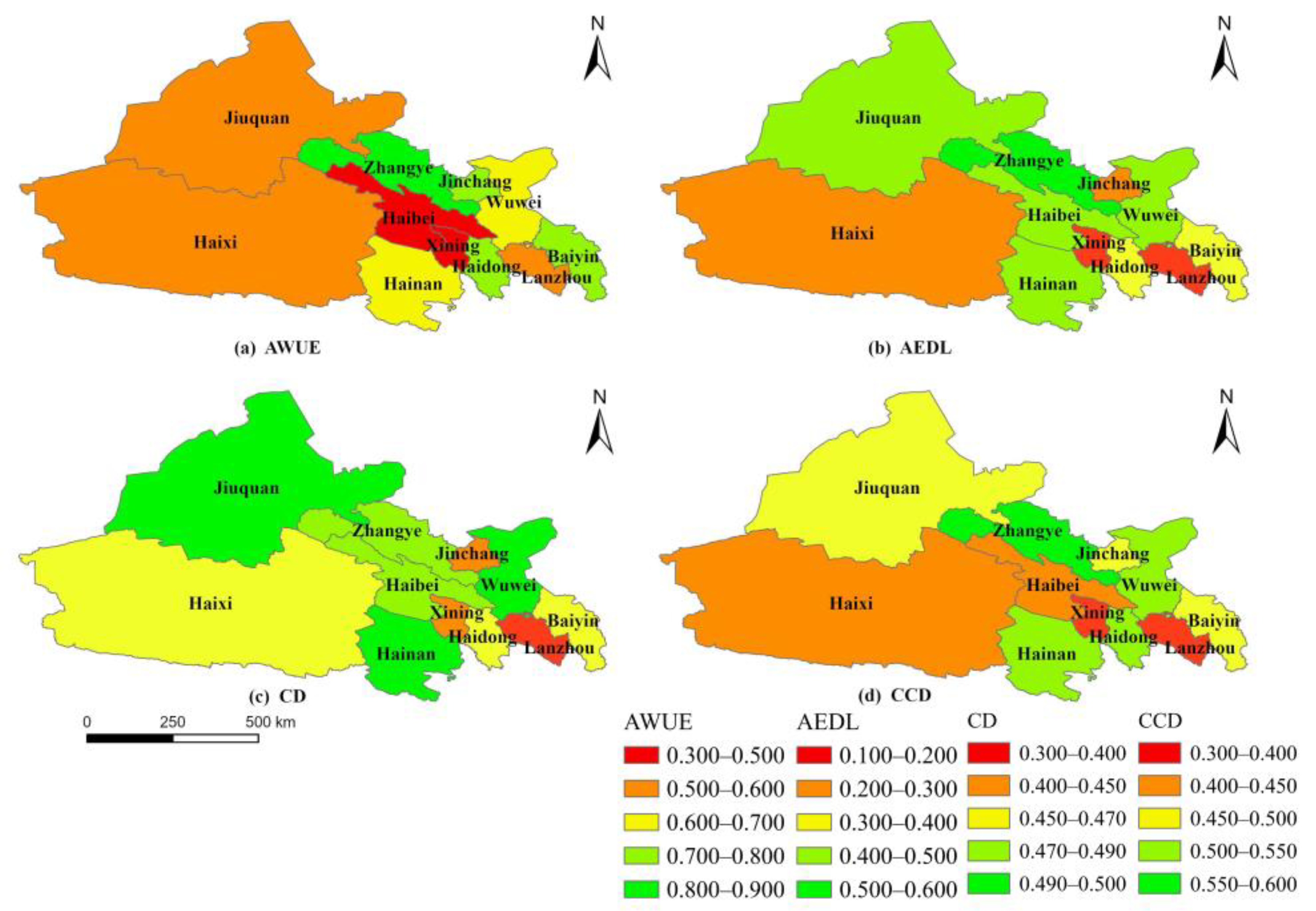 - The AWUE and AEDL are currently in a ‘low coupling, high coordination’ development phase. The coordinated development patterns evolved via four distinct pathways: a highly coordinated sustainability pathway, growth-oriented pathway, transitioning pathway, and improving pathway. Overall, the CCD was found to be highest in cities with integrated primary, secondary, and tertiary industries, followed by agriculture-based cities with supplementary sectors, and then others based on animal husbandry with agricultural supplementation and those that are industry-based with agricultural supplementation. Spatially, the CCD is summarized as ‘high in the middle, low in the east and west’, with high coordination areas expanding from Zhangye City to Hexi Corridor regions, from middle to east and west, and from the northern to southern foothills, moving towards a higher level of coordination overall.