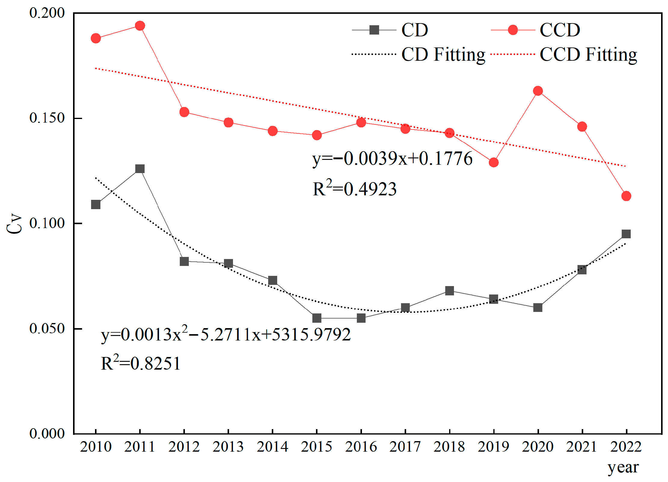 - Yang, G.M.; Yang, Y.R.; Gong, G.F.; Chen, X.L. The coupling and coordination characteristics of agricultural green water resources and agricultural economic development in China. Environ. Dev. Sustain. 2024, 26, 2131–2151. [Google Scholar] [CrossRef]
