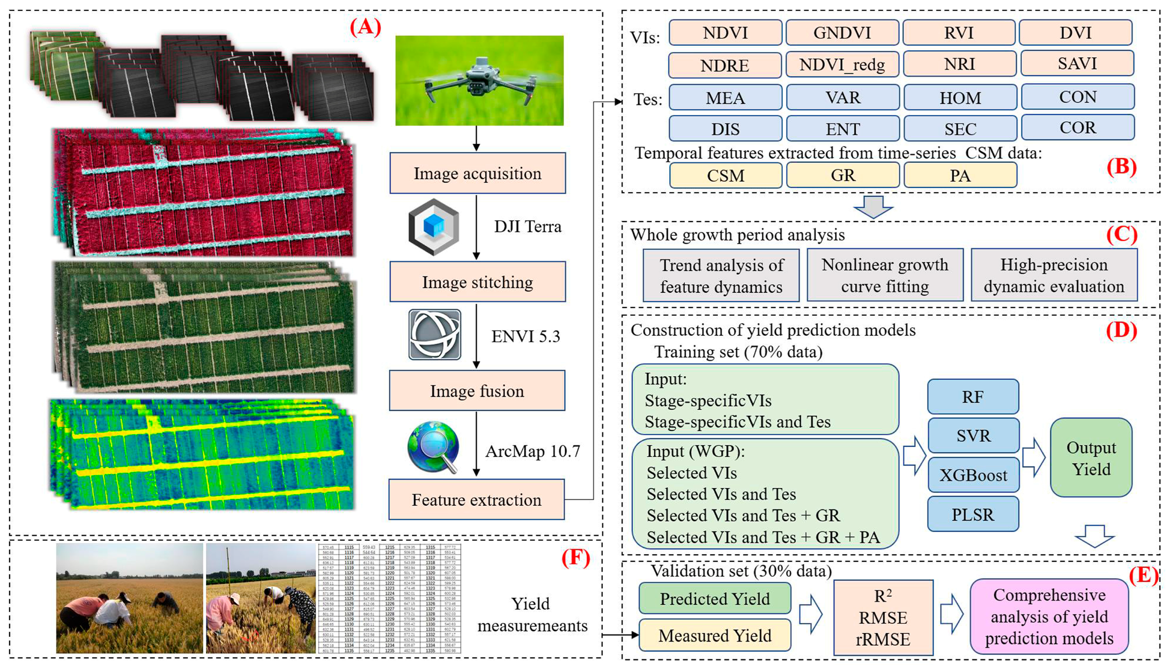 - Liu, T.; Wu, F.; Mou, N.; Zhu, S.; Yang, T.; Zhang, W.; Wang, H.; Wu, W.; Zhao, Y.; Sun, C. The estimation of wheat yield combined with UAV canopy spectral and volumetric data. Food Energy Secur. 2024, 13, e527. [Google Scholar] [CrossRef]