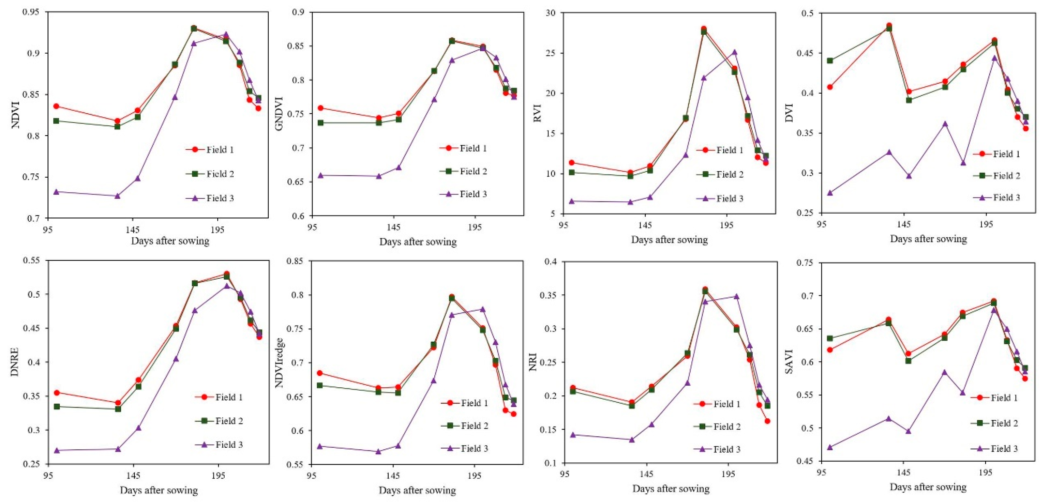 | NDRE | Normalized difference red edge index | (NIR − Red_edge)/(NIR + Red_edge) |