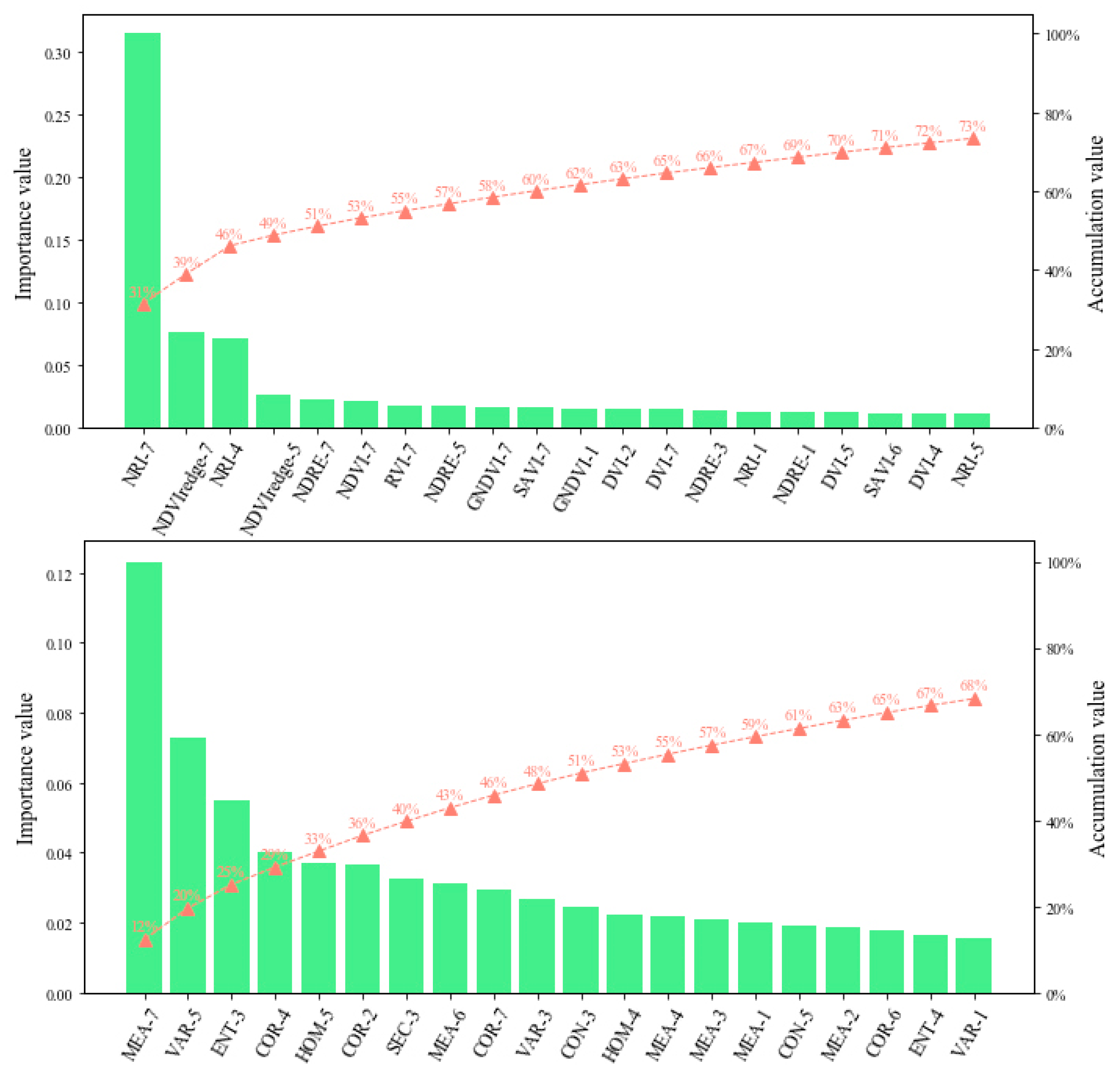 - Zhang, J.; Cheng, T.; Shi, L.; Wang, W.; Niu, Z.; Guo, W.; Ma, X. Combining spectral and texture features of UAV hyperspectral images for leaf nitrogen content monitoring in winter wheat. Int. J. Remote Sens. 2022, 43, 2335–2356. [Google Scholar] [CrossRef]