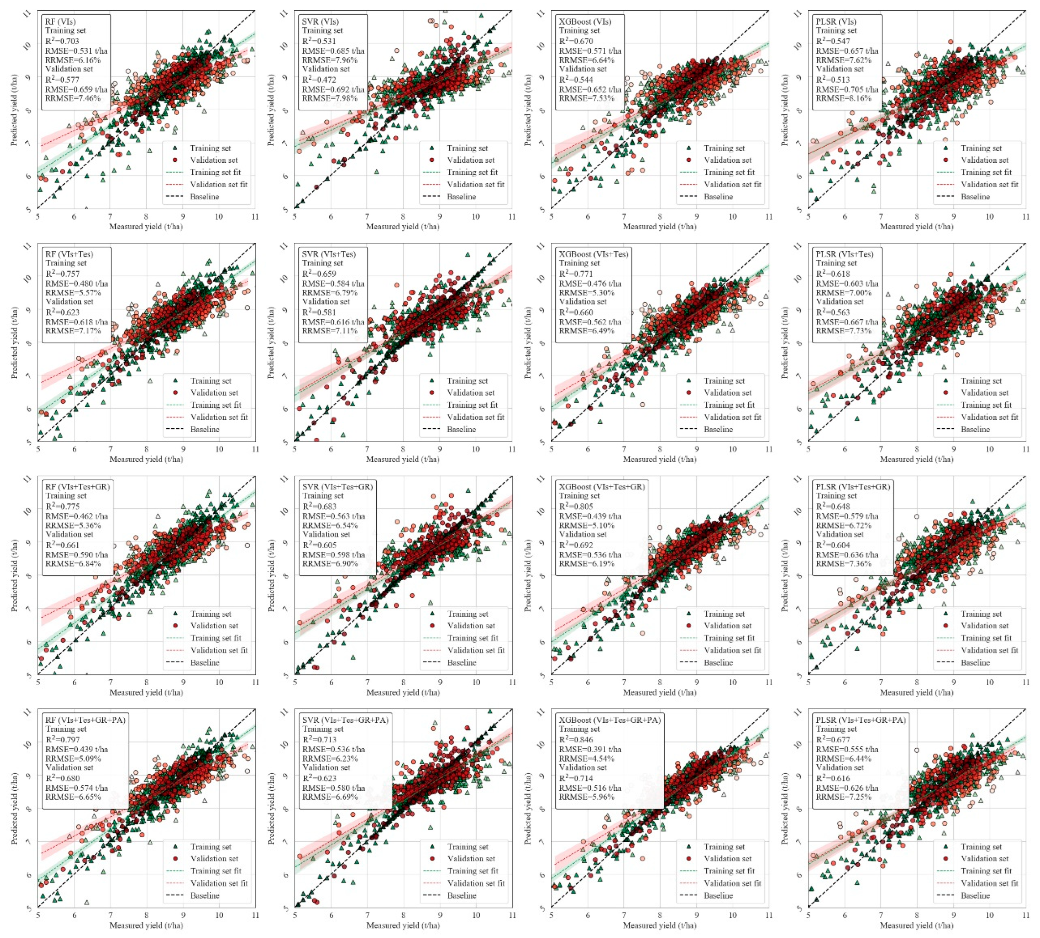 | Growth Stage | Model | Training Set R2 | Validation Set R2 | Training Set RMSE (t/ha) | Validation Set RMSE (t/ha) | Training Set rRMSE | Validation Set rRMSE |