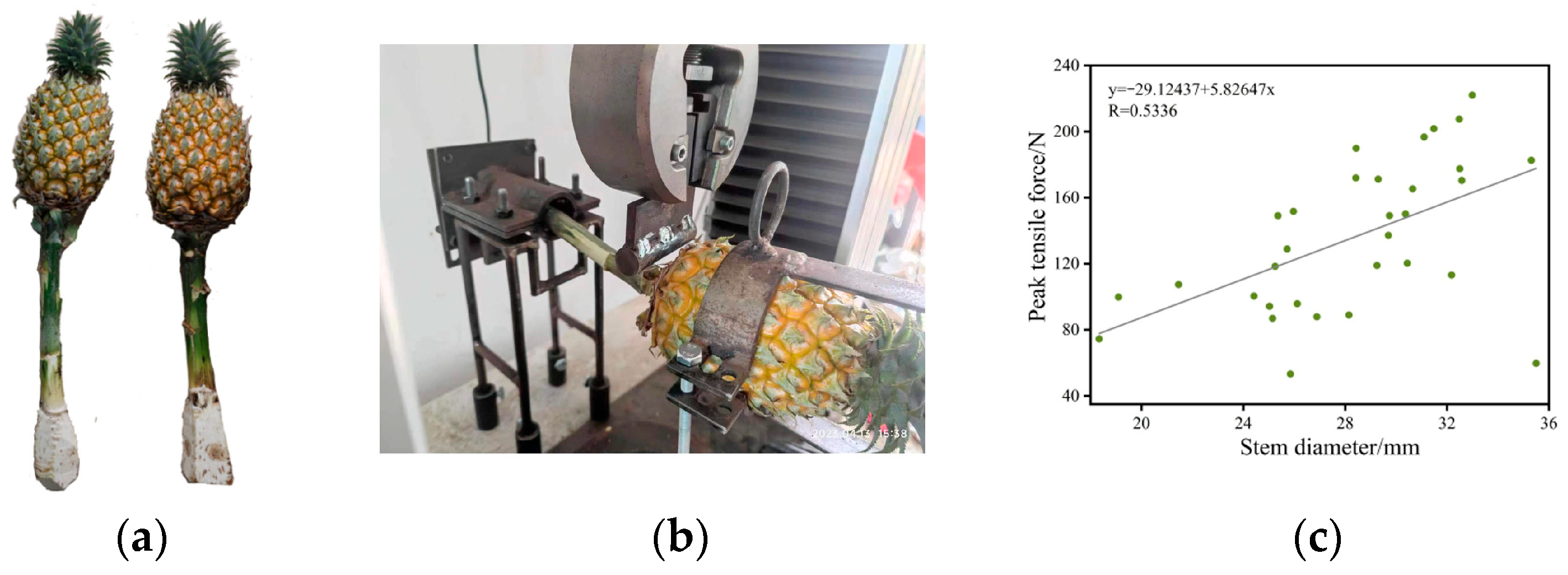 - Li, M.; He, L.; Yue, D.; Wang, B.; Li, J. Fracture mechanism and separation conditions of pineapple fruit-stem and calibration of physical characteristic parameters. Int. J. Agric. Biol. Eng. 2023, 16, 248–259. [Google Scholar] [CrossRef]