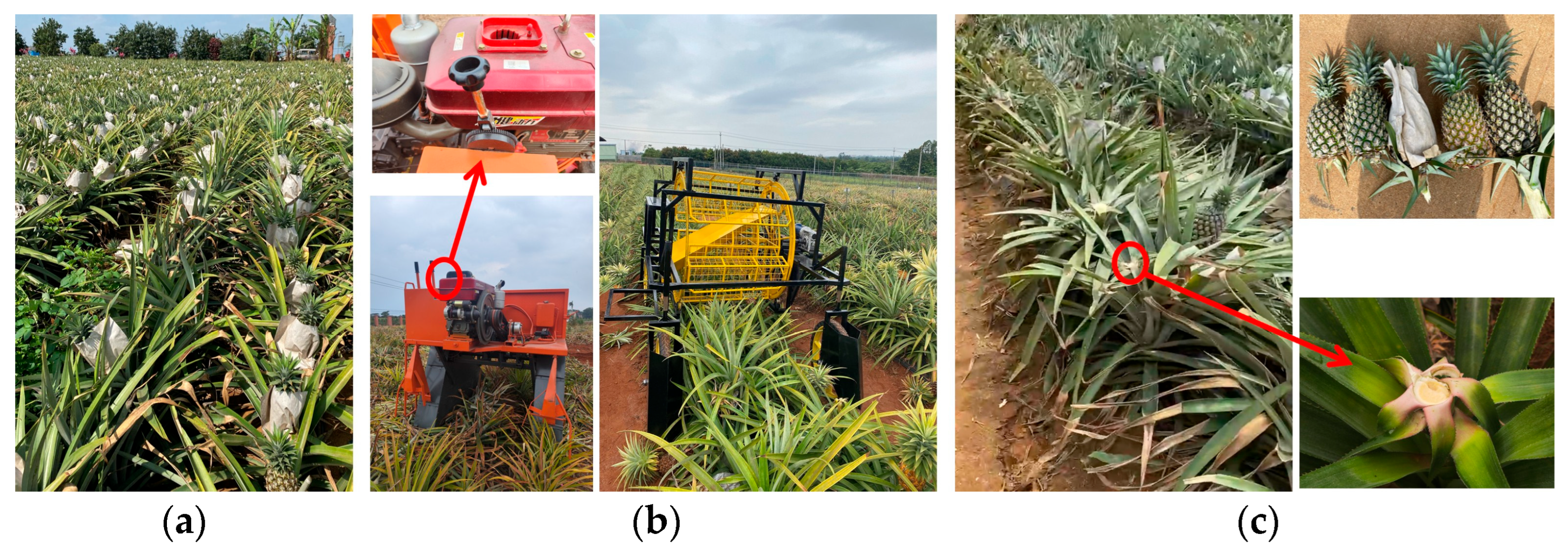 - He, F.G.; Zhang, Q.; Deng, G.R.; Li, G.J.; Yan, B.; Pan, D.X.; Luo, X.W.; Li, J.H. Research status and development trend of key technologies for pineapple harvesting equipment: A review. Agriculture 2024, 14, 975. [Google Scholar] [CrossRef]