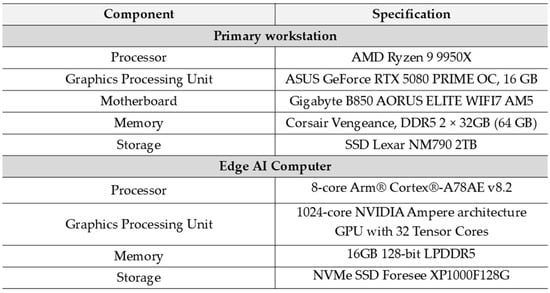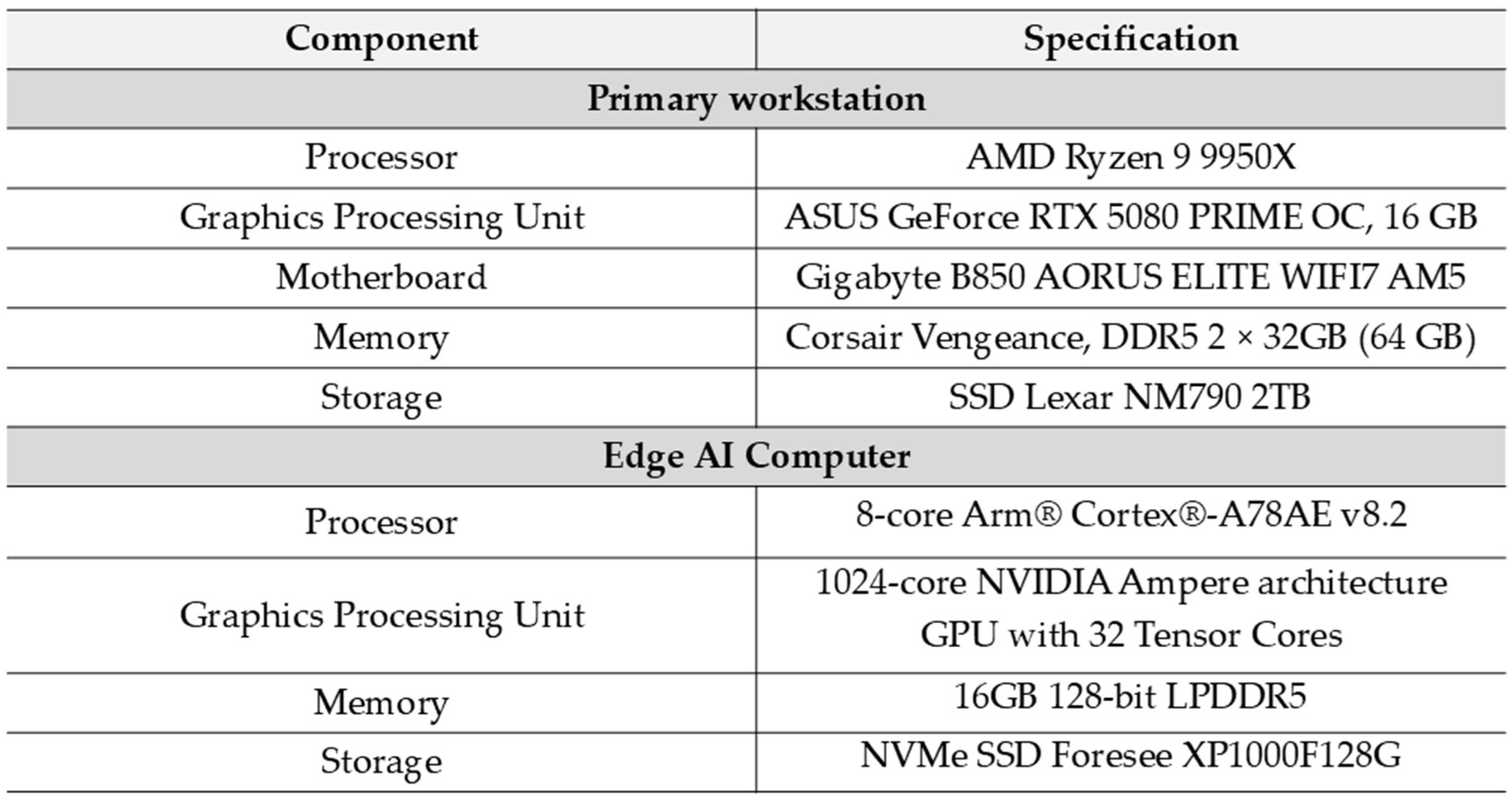 The primary workstation, equipped with an AMD Ryzen 9 9950X CPU (AMD, Santa Clara, CA, USA) and an ASUS GeForce RTX 5080 PRIME OC GPU (16 GB VRAM), was employed for data preprocessing, model training, and performance benchmarking. The system was further configured with a Gigabyte B850 AORUS ELITE WIFI7 AM5 motherboard (Gigabyte, Taipei, Taiwan), 64 GB of DDR5 memory (Corsair Vengeance, 2 × 32 GB; Corsair, Milpitas, CA, USA), and a 2 TB Lexar NM790 SSD for high-speed storage. The Edge AI computer, based on the NVIDIA Jetson Orin NX platform, was utilized for inference evaluation of YOLO models. This embedded system integrates an 8-core Arm® Cortex-A78AE v8.2 processor and a 1024-core NVIDIA Ampere GPU with 32 Tensor Cores, supported by 16 GB of 128-bit LPDDR5 memory and an NVMe Foresee XP1000F128G SSD (Figure 1).
