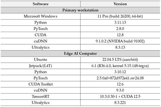 The primary workstation operated on Microsoft Windows 11 Pro (64-bit, build 26200), with a Python 3.11.13 environment and the PyTorch 2.8.0 deep-learning framework. Model training utilized CUDA 12.8 and cuDNN 9.1.0.2 (NVIDIA SDK 12.0.0.002) for GPU acceleration, together with the Ultralytics 8.3.13 library for YOLO model implementation and management. The Edge AI computer ran Ubuntu 22.04.5 LTS (aarch64) with NVIDIA JetPack 6.1 (Linux for Tegra R36.4.0, kernel 5.15.148-tegra). The deployment environment included Python 3.10.12, PyTorch 2.5.0 + CUDA 12.6, and cuDNN 9.3.0. TensorRT 10.3.0.30-1 was used for optimized inference, in conjunction with Ultralytics 8.3.221 (Figure 2).