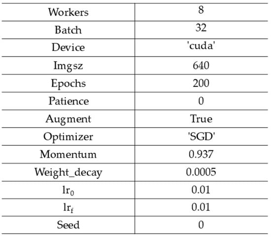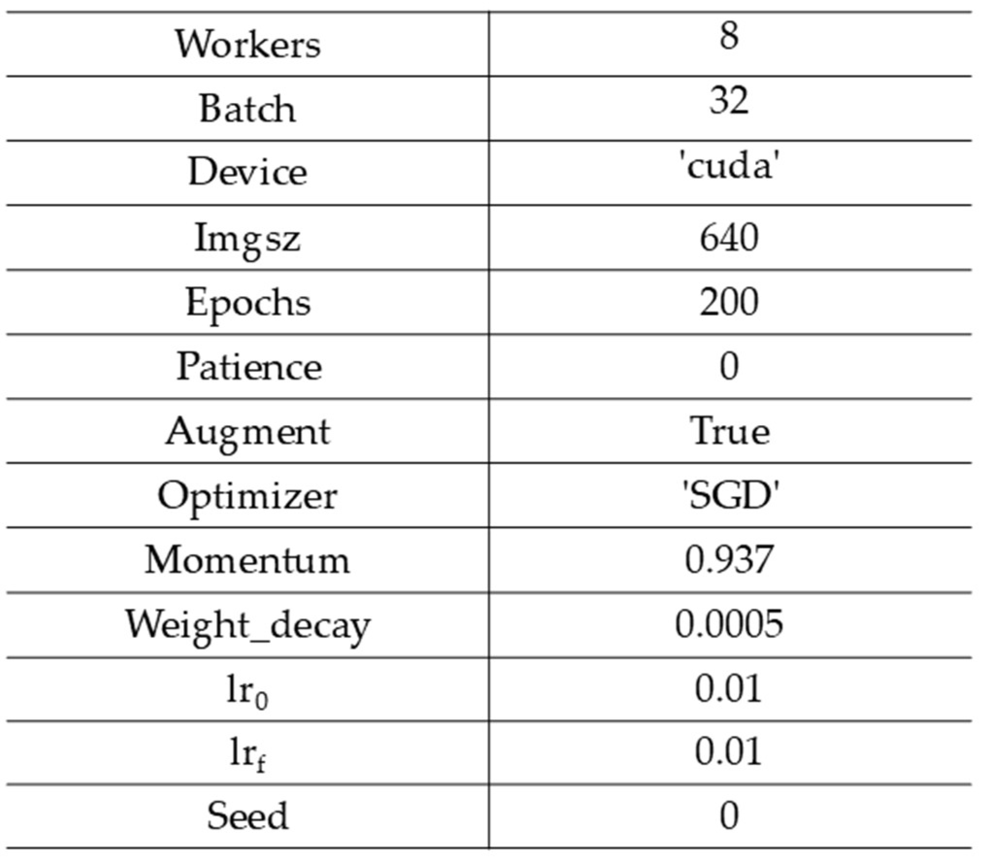 Each model was trained for 200 epochs with a batch size of 32 and an input image resolution of 640 × 640 pixels, which provides a balance between computational efficiency and detection precision. The stochastic gradient descent (SGD) optimizer was employed, configured with a momentum coefficient of 0.937 and a weight decay of 0.0005 to ensure stable convergence and regularization. The initial learning rate was set to 0.01 (lr0), decaying linearly to 0.01 (lrf) over the course of training. A fixed random seed (0) was used to guarantee experimental reproducibility. Data augmentation was enabled (augment = True), allowing the model to generalize better to unseen data through on-the-fly geometric and photometric transformations. The training utilized 8 parallel data-loading workers to optimize throughput on the GPU and was executed entirely on the CUDA device, leveraging the RTX 5080 GPU described previously. The patience parameter was set to 0, ensuring that early stopping was disabled so that all models completed the full 200 epochs (Figure 3).