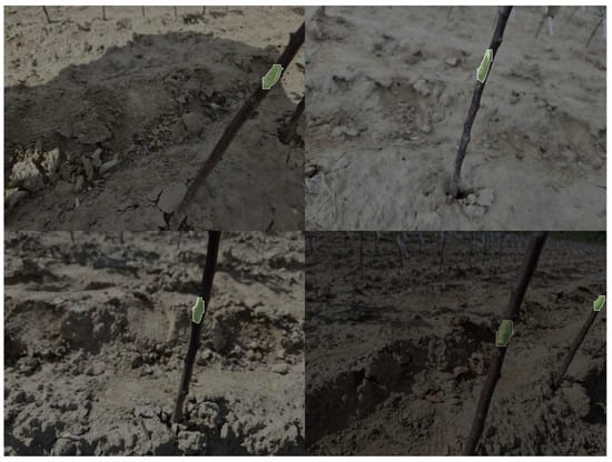 Photographic data were collected during the 2025 growing season at an apple tree nursery located in eastern Poland (51.224726° N, 22.426559° E). Apple rootstocks of the M26 variety, with diameters of 6–8 mm and 8–10 mm, were planted at intervals of 22–25 cm within rows and 85 cm between rows. One-year-old scions were collected from the Golden Delicious cultivar. The rootstocks were budded on the southern side at a height of 22–24 cm. The image dataset was acquired using a Samsung Galaxy S25 smartphone (Samsung Electronics Co., Ltd., Suwon-si, Republic of Korea) equipped with an RGB camera sensor (1/1.56″, 50 MP) providing a native resolution of 8160 × 6120 pixels [27]. A total of 3630 images were captured before the budding sites were covered with protective foil.