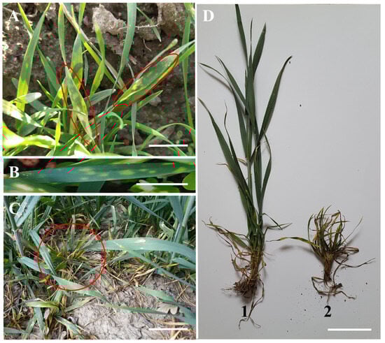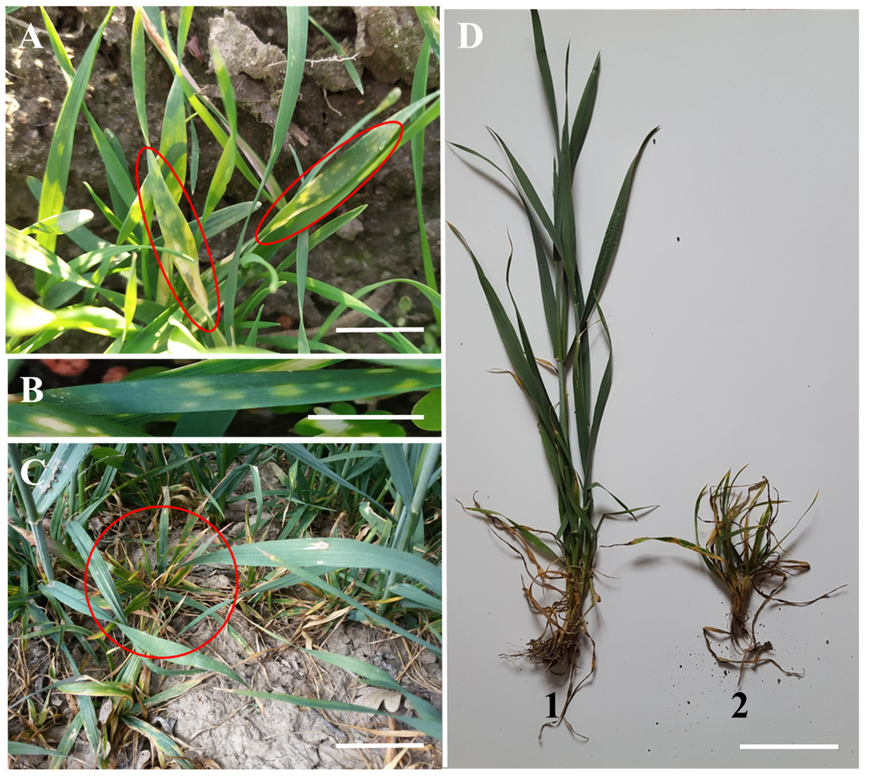 Symptoms observed on winter wheat plants: (A,B) yellow discolorations occurring during the tillering phase; (C) growth inhibition; (D) comparison of asymptomatic plant (1) and symptomatic one (2). Scale bar = 2 cm.