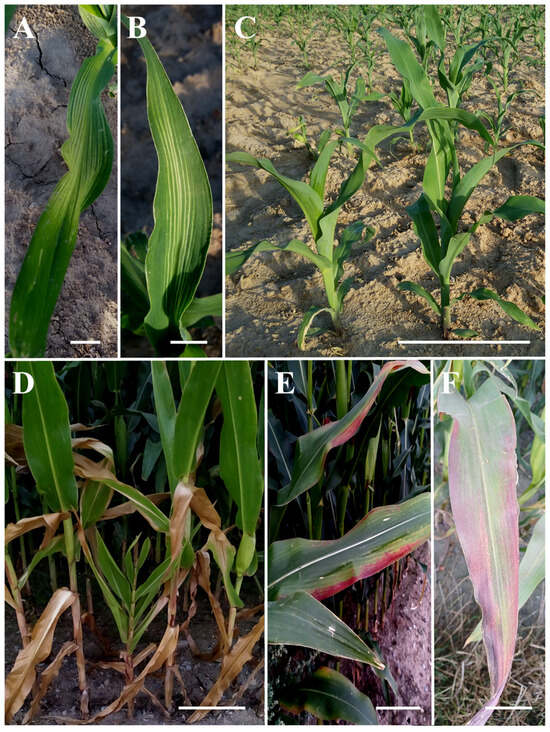 Symptoms observed on maize plants: (A,B) bright, long, parallel stripes along the veins at BBCH stage 17–18; (C) asymptomatic plants; (D) reduced growth apparent at BBCH stage 39; (E,F) red discolorations on the outer edges of leaves. Scale bar = 2 cm (in (A,B,E,F)) or 40 cm (in (C,D)).