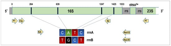 Single nucleotide polymorphisms (SNPs) were observed at several positions in the ribosomal sequences from wheat, indicating inter-operon heterogeneity. To confirm this and differentiate the 16S rRNA sequences from rrnA and rrnB operons, we used the primers RevI-S and RevI-R, which target operon-specific ITS regions. Sequencing of the resulting amplicons confirmed that the wheat-derived phytoplasma strain possesses two heterogeneous 16S rRNA gene copies. Nucleotide differences were detected at positions 264 (C/T), 639 (A/G), 1247 (T/C), and 1425 (C/T) of the P1/P7 region (Figure 3).