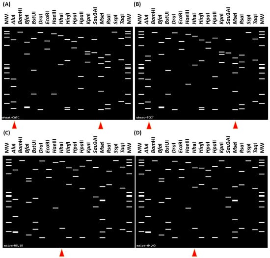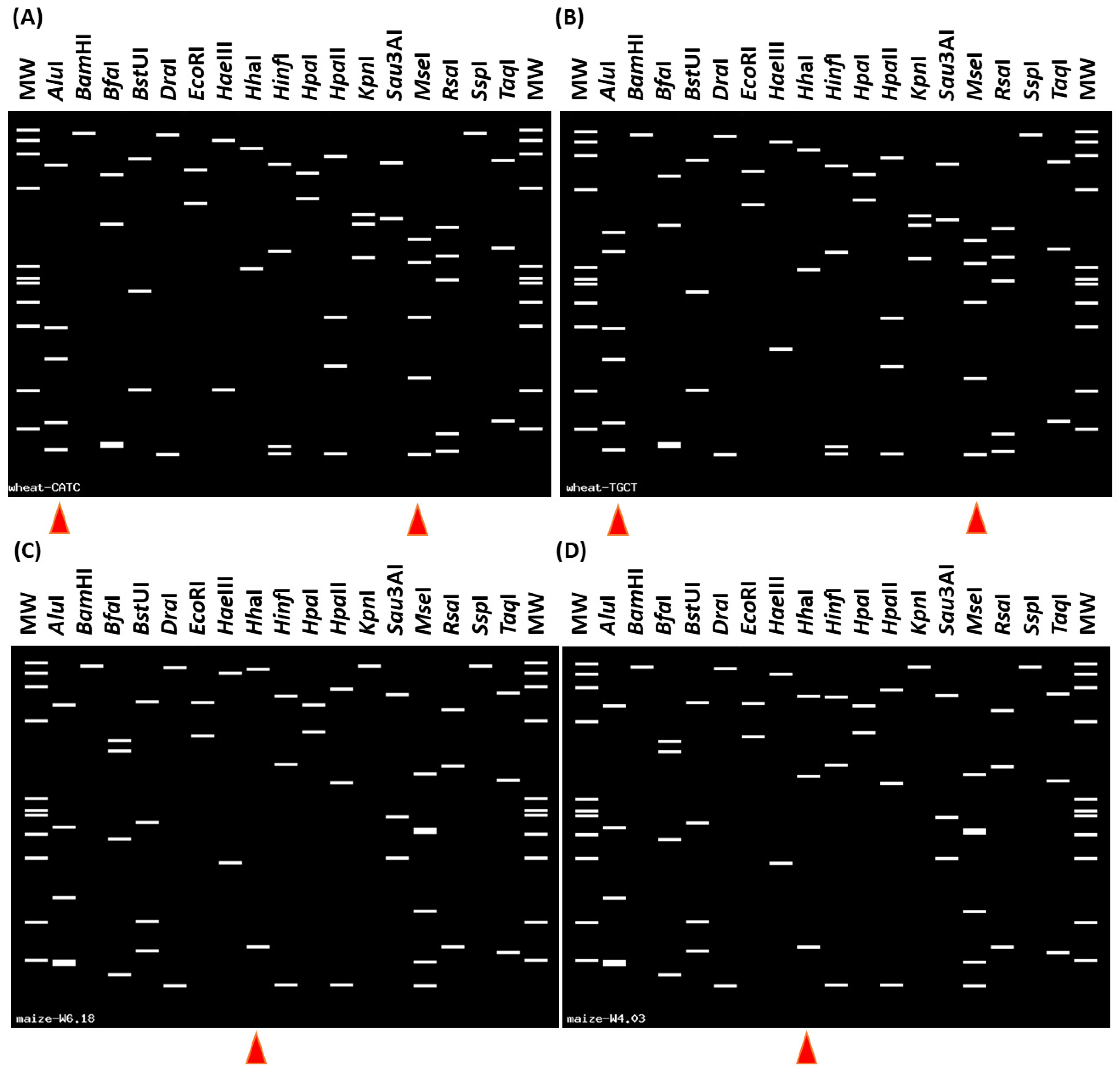 Virtual RFLP patterns derived from in silico digestion of 16S rRNA gene F2nR2 fragment of phytoplasma strains amplified from wheat (A,B) and maize (C,D) samples. (A) ‘CATC’ (rrnA) variation pattern is identical (similarity coefficient 1.00) to the reference strain of subgroup 16SrI-S (HM067755) (B) ‘TGCT’ (rrnB) variation pattern is identical to the reference strain pattern of subgroup 16SrI-R (HM067754). (A,B) The enzymes AluI and MseI yielded distinctive digestion profiles, marked by red triangles. The phytoplasma strain infecting wheat belongs to the 16SrI-(S/R)C subgroup. (C) The virtual RFLP pattern is identical to the reference pattern of phytoplasma subgroup 16SrV-C (AY197642). (D) The virtual RFLP pattern derived from the maize W4.03 sample is most similar to the pattern of subgroup 16SrV-C (similarity coefficient 0.97). (C,D) Distinctive digestion profiles of enzyme HhaI were found between maize phytoplasma samples W6.18 and W4.03 (red triangles). The maize phytoplasmas W4.03 and W6.18 are members of 16SrV-C.