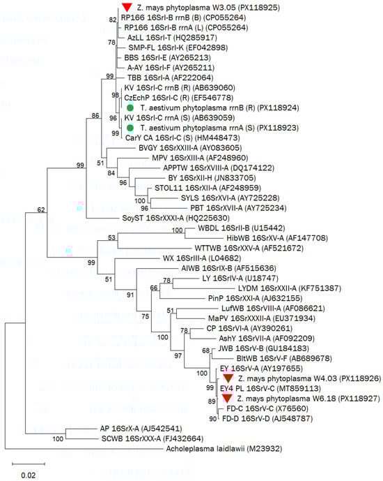 To assess the evolutionary interrelationships between phytoplasma strains, a phylogenetic tree was constructed based on 16S rRNA gene fragment (1482 nt). Sequences of phytoplasma detected in wheat and maize were aligned together with 39 sequences of phytoplasmas representing different ribosomal groups and subgroups, retrieved from the GenBank database. Acholeplasma laidlawii strain was selected as the out-group to root the tree. Multiple sequence alignment was generated using ClustalW program v. 3.1, built-in BioEdit v. 7.2.5 [38]. A phylogenetic tree was constructed in MEGA12 using the Maximum Likelihood method. The Tamura–Nei substitution model, identified in MEGA as the best-fitting model for the analyzed sequences, was applied [39]. Branch support was assessed by bootstrapping with 1000 replicates.