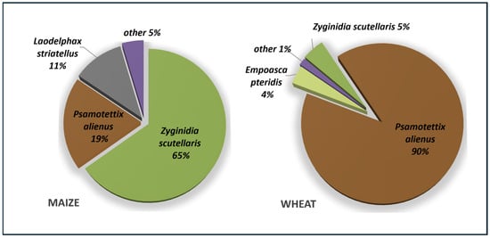 Composition of leafhopper and planthopper taxa collected from maize (August 2018) and wheat (May 2019). Low-frequency species detected in maize fields (other 5%) included Empoasca pteridis, Macrosteles laevis, Mocuellus collinus, Streptanus aemulans, Stenocranus sp., Dicranotropis hamata. Low-frequency species detected in wheat fields (other 1%) included: Z. pullula, Zygina flammigera.