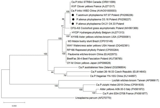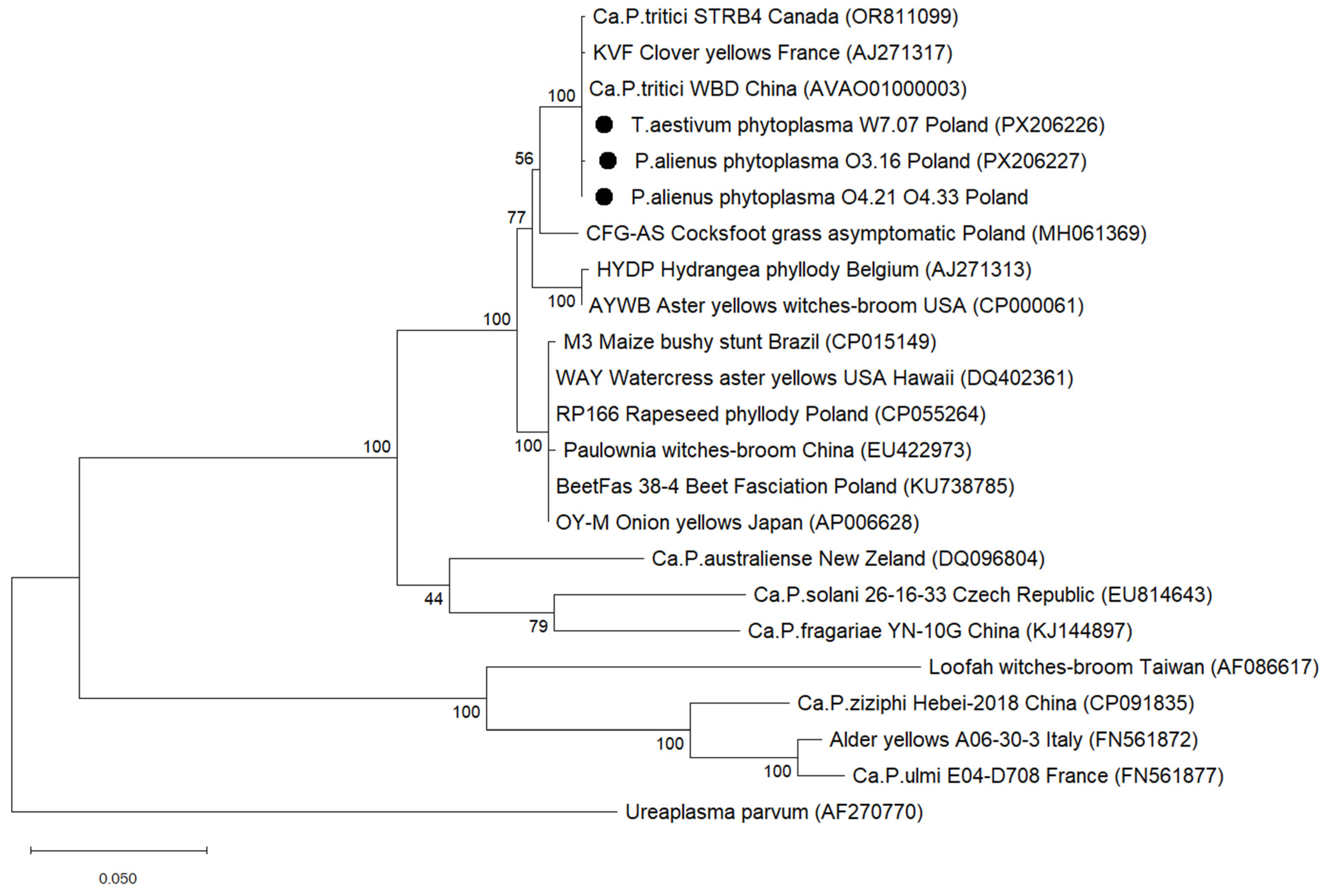 Furthermore, pairwise comparison of the 16S rRNA gene variants revealed that the phytoplasma strain isolated from wheat samples in Poland shares identical sequences with the WBD phytoplasma (NCBI reference NZ_AVAO01000003), previously identified in China as subgroup 16SrI-(R/S)C—commonly referred to as the 16SrI-C strain—and recently named ‘Ca. Phytoplasma tritici’ [6]. Although the WBD sequence is not currently retrievable via standard BLAST searches, the similarity between the sequences was confirmed through direct comparison.