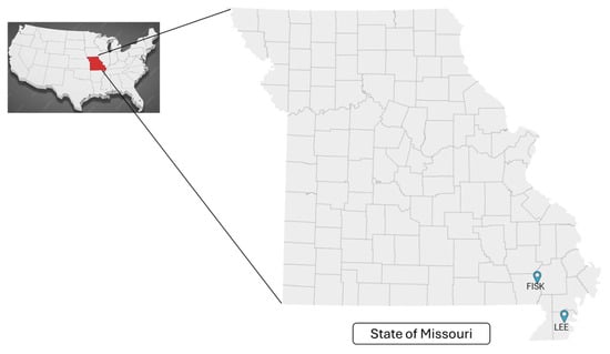 Location of Missouri, USA and two Missouri field environments used in this study—LEE (36.403 N, 89.595 W) in Pemiscot County and FISK (36.802 N, 90.211 W) in Butler County.