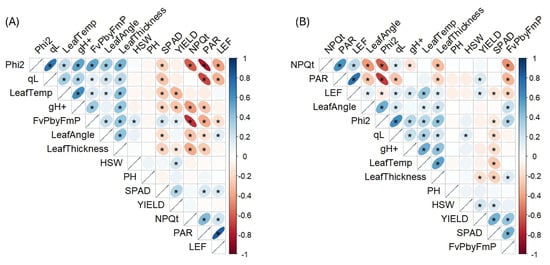 We next investigated the correlations between CF parameters with seed yield, since photosynthesis is one of the major determinants of yield. Pearson correlation was calculated among yield and photosynthetic traits during both developmental stages (S1 and S2) (Figure 2). During the S1 stage (Figure 2A), several photosynthetic traits showed significant (p < 0.05) correlation with yield including FvP/FmP (r = 0.19), gH+ (r = −0.24) and SPAD (r = 0.34). FvP/FmP was also significantly correlated with HSW (r = 0.22, p < 0.05). Additionally, leaf temperature (r = −0.31) and thickness (r = −0.17) also demonstrated significantly negative correlations with yield (p < 0.05). SPAD showed a significant positive relationship with FvP/FmP (r = 0.25), PAR (r = 0.21) and LEF (r = 0.19). NPQt showed highly negative relationships with most of photosynthetic and leaf morphological traits, except for PAR (r = 0.49) and LEF (r = 0.98). Phi2 also showed very high correlation with qL (r = 0.81).