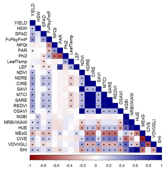 Correlation heatmap among yield, photosynthetic traits and UAV-derived vegetation indices (both Multispectral and RGB) at the S2 stage. Asterisks (*) indicate significant correlations at p < 0.05.