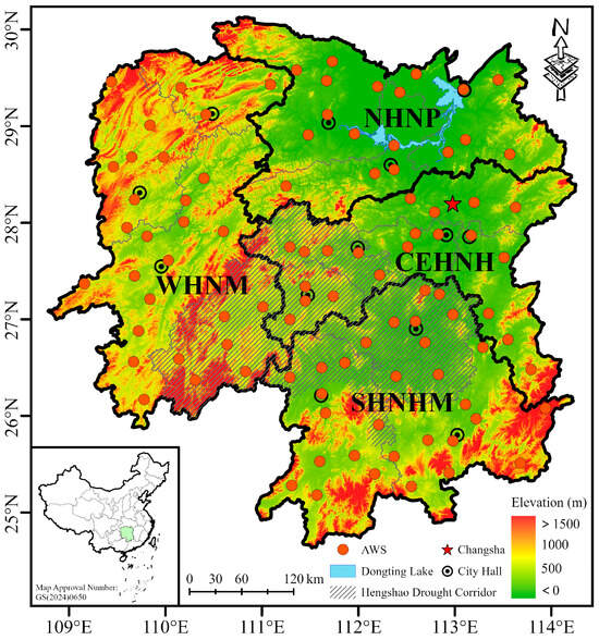 Hunan Province (24°38’–30°08’ N, 108°47’–114°15’ E) is located in the central-southern region of China, along the southern bank of the middle Yangtze River. The province is bordered by mountains on three sides, exhibiting complex topography and landforms that primarily consist of mountainous and hilly terrain. This terrain gradually transitions to hills and flat land in the central and northern regions, forming an asymmetrical horseshoe shape that opens to the northeast from the southeast, south, and west (Figure 1). Hunan Province experiences a typical subtropical monsoon humid climate, characterized by abundant precipitation that is unevenly distributed in both time and space. The combined effects of irregular rainfall and high temperatures lead to the occurrence of drought almost annually.