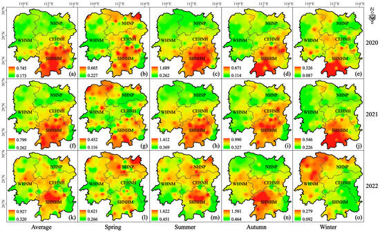 Figure 2a,f,k illustrates that the annual average VPD in Hunan Province has increased annually, exhibiting an overall spatial distribution pattern of “higher in the south and lower in the north, higher in the east and lower in the west.” Notably, the spatial distribution of VPD during the summer and autumn seasons closely resembles the annual average pattern, particularly in summer. Although temperatures decline in autumn, the air remains relatively dry as it transitions from summer to winter, leading to VPD values that are second only to those in summer. In spring, low-value areas are predominantly distributed in the NHNP Luoxiao Mountains and the Wuling Mountains within the WHNM, which is associated with the increase in local precipitation caused by topographic uplift [23]. Precipitation influences changes in RH [24], which subsequently affects VPD. The high-value areas are relatively dispersed, primarily concentrated along the edges of the Dongting Lake Plain in the NHNP and in the hilly region of the SHNHM. The overall VPD values in winter across the province are relatively low, reflecting the climatic characteristics of regions with high atmospheric humidity and weak vapor pressure deficit during the winter season.