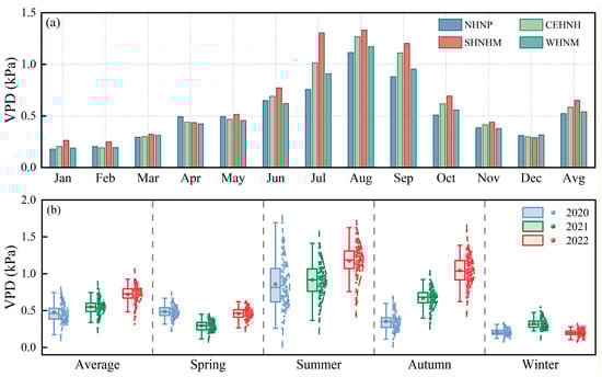 Overall, the annual average VPD exhibits a sharp increase during the 2020–2022 period, particularly in 2022, specifically increasing from 0.48 ± 0.12 kPa in 2020 to 0.55 ± 0.11 kPa in 2021 (+14.6%), and subsequently rising to 0.72 ± 0.11 kPa in 2022 (+30.9%) (Figure 3b), this upward trend within the three-year period reflects rapid VPD intensification during recent extreme climate conditions. It is consistent with findings at global [30], national [31], and regional scales [32], indicating that the intensification of drought has a universal characteristic across different scales. And from a seasonal perspective, there is a decreasing trend of “summer > autumn > spring > winter.” The summer and autumn of 2022 were exceptionally dry, with high temperatures lasting longer than historical records [33]. The boxplot for Autumn 2022 is particularly alarming, showing a near-complete separation from the 2020 distribution, with the median VPD at monitoring sites in 2022 (1.04 kPa) reaching 2.97 times that of 2020 (0.35 kPa). The delayed retreat of the subtropical high in 2022 extended the duration of high temperatures, resulting in the continuation of extremely high VPD characteristics across seasons [34]. This suggests that the seasonal climate characteristics do not follow a simple linear trend.