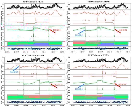 Similarly, the abrupt changes in VPD in the CEHNH region (3 September 2020) and the WHNM region (2 September 2020) coincide with the heading stage of late rice, and the SHNHM region detected a unique high-probability seasonal abrupt change point in the autumn (3 September 2020). Only the NHNP region did not exhibit significant trends or seasonal changes during this period. In-depth analysis revealed a declining trend in VPD at the point of change, and meteorological observation data indicated that the precipitation in the CEHNH and WHNM regions was less than 1 mm before the change point, but significant rainfall replenishment occurred after 2 September, alleviating water stress on crops during the heading stage.