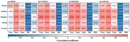 Seasonal and annual average correlation coefficients between VPD and meteorological factors across different regions of Hunan Province: (a) NHNP; (b) CEHNH; (c) SHNHM; (d) WHNM. Rows represent seasons (top to bottom: Winter, Autumn, Summer, Spring, Annual average), columns represent meteorological factors (, , , RH, PRE), and colors indicate correlation coefficient magnitude.