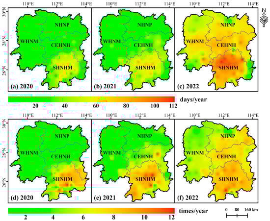 Spatial distribution of days and persistent events with VPD > 1.5 kPa in Hunan Province, 2020–2022: (a–c) Days with VPD > 1.5 kPa (2020–2022); (d–f) Frequency of events with VPD > 1.5 kPa lasting ≥3 days (2020–2022). Regional labels: NHNP, WHNM, CEHNH, SHNHM.