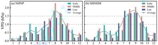 Ten-day scale intermonthly distribution of vapor pressure deficit (VPD) in NHNP (a) and SHNHM (b) regions in 2022 (Early: first ten days, Middle: middle ten days, Late: last ten days; Average: mean value).