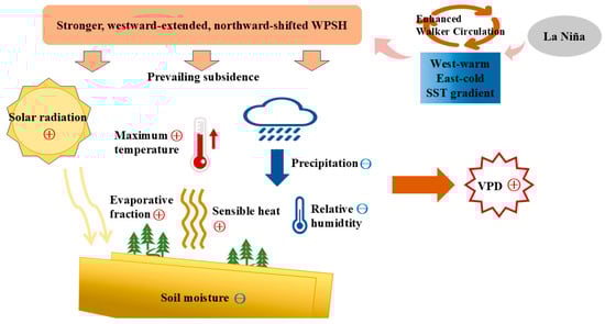 Mechanism of anomalous WPSH driving increased VPD under La Niña conditions. Arrows denote causal relationships between factors. La Niña’s west-warm/east-cold SST gradient enhances the Walker Circulation, leading to stronger, westward-extended, northward-shifted WPSH and subsidence. These drive elevated radiation, reduced precipitation, higher temperature, lower humidity/soil moisture, and altered evaporative fraction/sensible heat—collectively raising VPD.