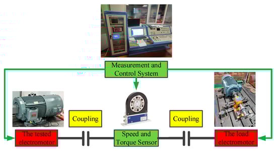 The research of this paper adopted the method of motor back-to-back to test the efficiency characteristics of the YXVF280M-2 model drive motor. The load motor used the YE3-280M-2 model motor (with a rated power of 90 kW). The drive motor consumes electrical energy, outputs torque and rotational speed, and drives the load motor to rotate. The above two motors were directly connected by a coupling, and a K-T40B-001R-MF-S-M-DU2-1-U model HBM torque sensor was set. The torque measurement range of this sensor is 0~1000 Nm, the output signal is 60 kHz ± 30 kHz and ±10 V, and it is equipped with a magnetic rotational speed measuring system (1024 pulses/rev). The schematic diagram of the test platform is shown in Figure 2.