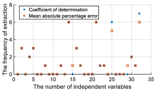 According to Figure 10, the independent variables extracted based on the principle of the highest coefficient of determination and the principle of the lowest mean absolute percentage error only differ when M = 3. The independent variable numbers extracted by the former are 14 (T−1out), 25 (ninε2), and 32 (ln(ε)), respectively; the independent variable numbers extracted by the latter are 14 (T−1out), 15 (ε−1), and 29 (sin(ε)), respectively. Therefore, the statistical frequencies of each independent variable under the two principles in Figure 10 are highly consistent (only four independent variables have a fluctuation of ±1). The variables with the highest influence degrees (occurrence frequency probability ≥75%) are variable 14 (T−1out), variable 21 (ninToutε), variable 25 (ninε2), and variable 32 (ln(ε)). The variables with medium influence degrees (occurrence frequency probability ≥25%) are variable 2 (Tout), variable 4 (n2in), variable 16 (ninTout), and variable 30 (ln(nin)).