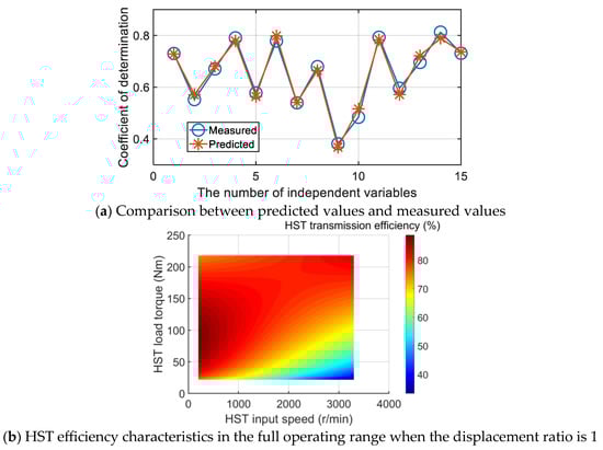 According to Figure 11, the coefficient of determination of the finally established five-variable PLS regression model is approximately 0.9799, and the mean absolute percentage error is approximately 2.4688%. The established model has high accuracy. When the variable pump displacement ratio is 1, the working efficiency range of the HST is 33.3197~88.6452%. In this state, the high-efficiency working area of the HST is relatively large. The proportion of areas with working efficiency greater than 70% is approximately 79.8889%, the proportion of areas with working efficiency greater than 80% is approximately 34.2222%, and the proportion of areas with working efficiency greater than 85% is approximately 6.5556%. The HST has low working efficiency under high rotational speed/medium- and low-load conditions, and it is advisable to avoid using it in such working areas.
