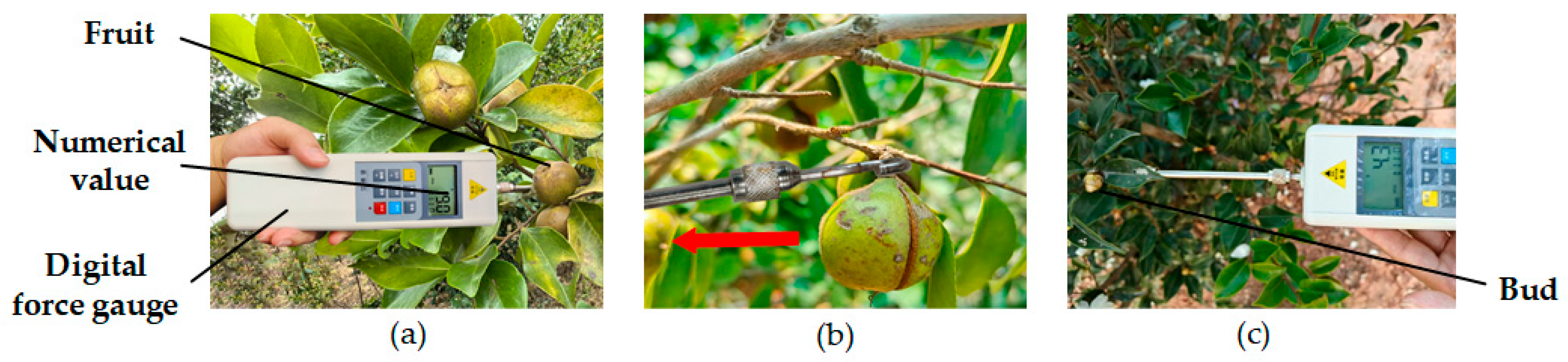 - Wang, R.; Fang, D.; Wu, C.; Wang, B.; Zhu, H.; Hu, T.; Wu, D. Dynamic Response of Camellia Oleifera Fruit-Branch Based on Mathematical Model and High-Speed Photography. Biosyst. Eng. 2024, 237, 232–241. [Google Scholar] [CrossRef]
