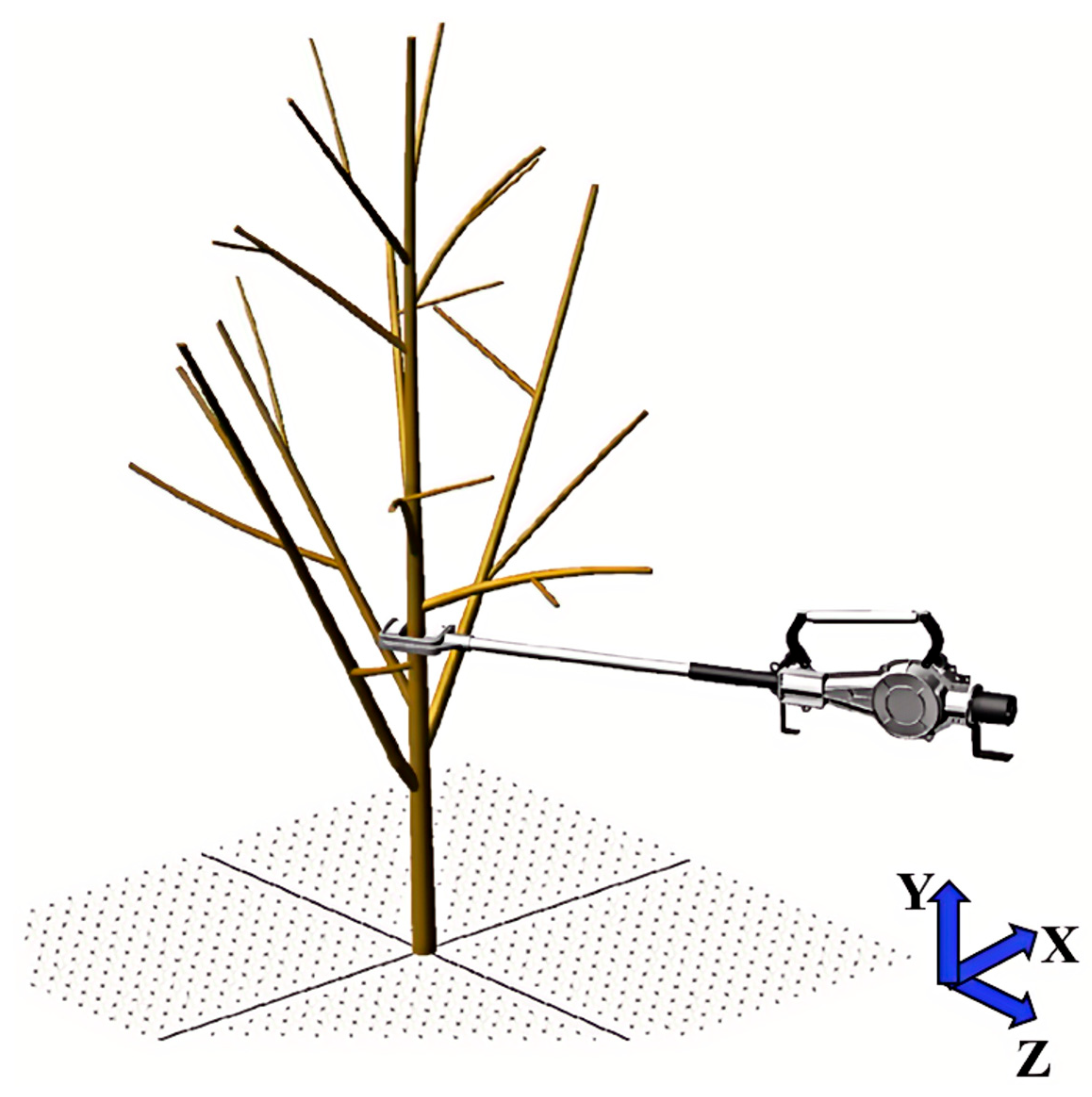 - Wang, Y.; Xu, L.; Zhang, Y.; Zhu, Y.; Zhou, H.; Cui, W.; Zhang, A. Study of Vibration Patterns and Response Transfer Relationships in Walnut Tree Trunks. Sci. Hortic. 2024, 337, 113567. [Google Scholar] [CrossRef]